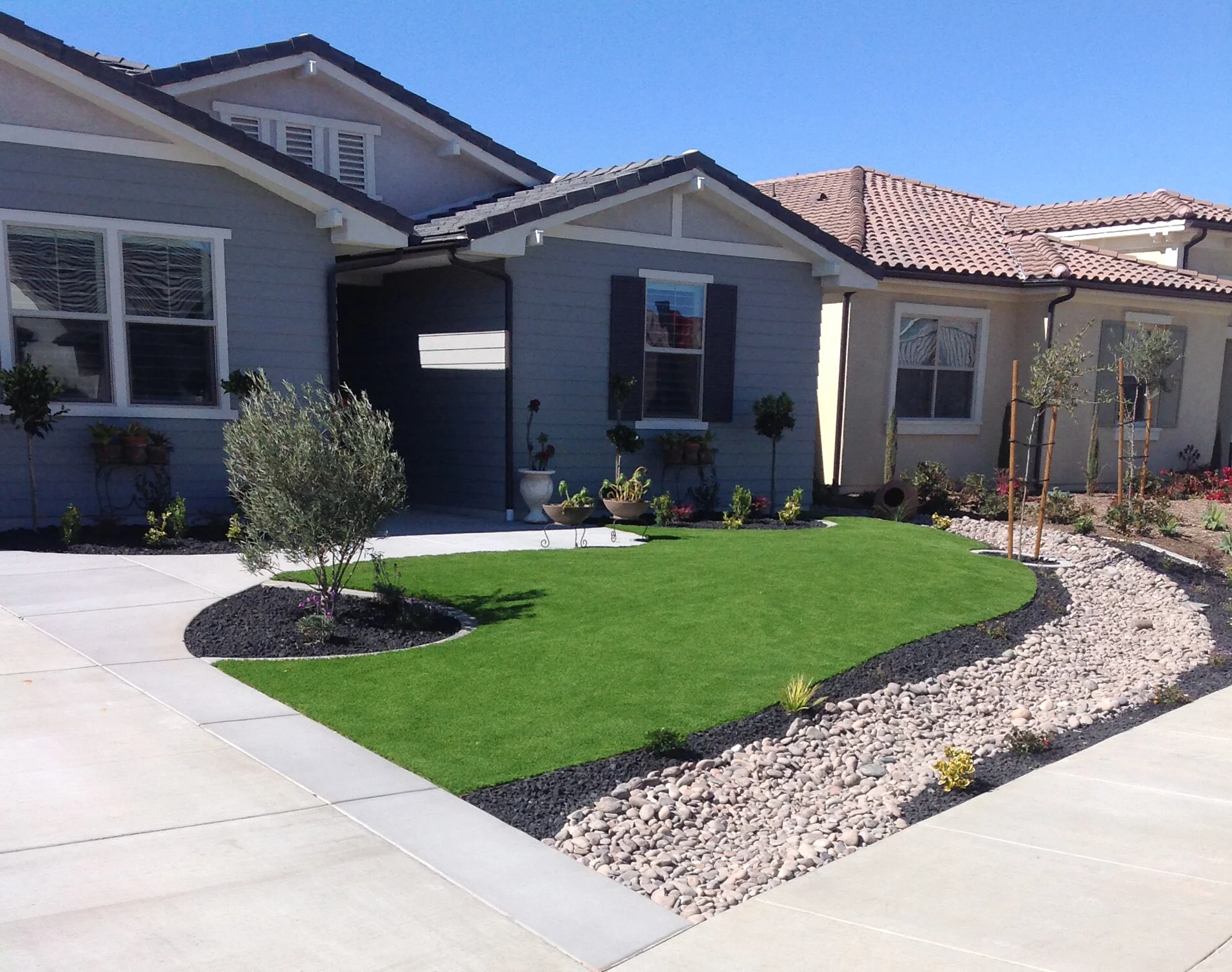 Wanting a low maintenance front yard, our clients opted for an artificial turf lawn, faux riverbed, and minimal drought tolerant plants.